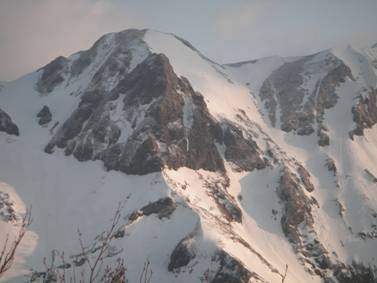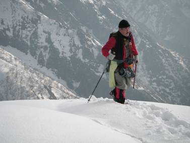 仏岩峠より1ピッチ上の送電線鉄塔上より残雪があり、三岩山の通過は氷化した岩場のアップダウンが続く。