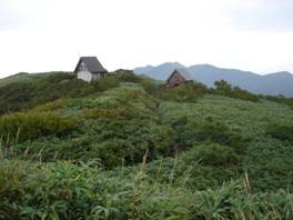 ![]() 【避難小屋・トイレ(山頂より)】 白い建物がトイレです、登る途中で最初に見える建物はトイレです。 |