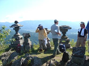 【岩肌に滴(したた)る汗よ戸神山 登り詰めれば山並みはるか】 戸神山頂には標柱があり、山座同定ができる。山頂の祠(ほこら)群は、里人の信仰の厚さを物語っている。 | |