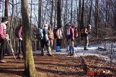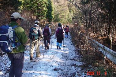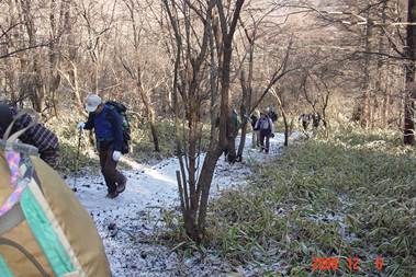 ![]() 硯石手前の広場で立ち休憩。 ここからは昨夜の雪がうっすらと残っていた。 |