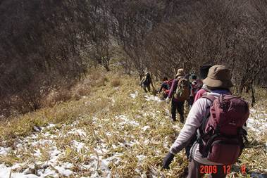 ![]() 頂上からの下山道は熊笹で覆われていた。 粘土の土は水を含んでいてとっても滑りやすかった。 |