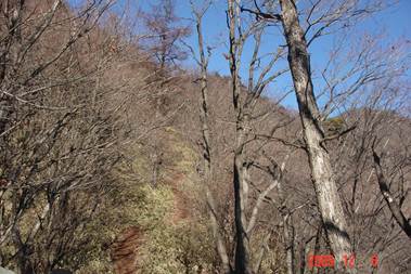 ![]() 途中の林道から見上げた冬枯れのくぬぎ林。 真っ青な空が美しい。 |