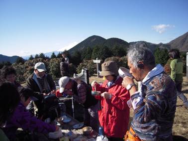 頂上は広々としたカヤトで大勢のパーティーで賑わっていた。
