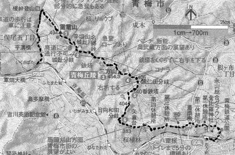 軍畑駅(9:12着)〜榎峠登山口(9:50)〜雷電山494m(10:30)〜名郷峠〜小ピーク昼食〜三方山454m〜矢倉台〜JR青梅駅(14:50)=立川=西国分寺=新松戸=我孫子