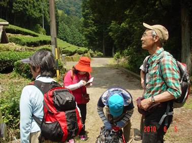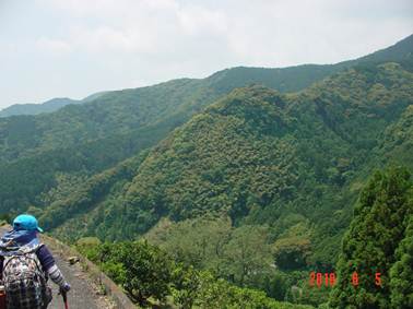 ![]() 古道を抜けると一気に展望が開けて初夏の緑がまぶしい。 気持のよい風が通り抜けて行く。 |