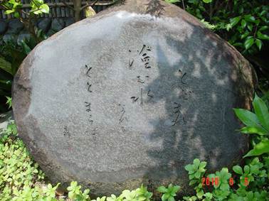 ![]() 柴屋寺入り口には満月を思わせるまあるく大きな岩があり。 「とどまれば澄む水なれどとどまらず」と刻まれていた。 |