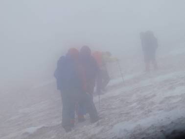 ![]() 【雪渓とガス】 まるで八甲田山、死の彷徨だ。 我々はどこに向かって歩いているのか。 先が見えない。 |