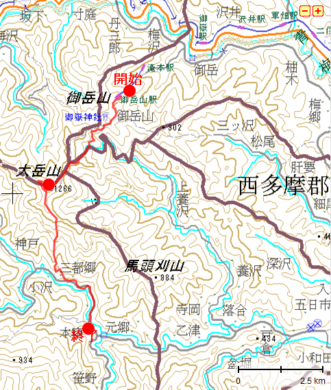 =御岳山駅(8:50)〜御岳山(9:20/30)〜大岳山神社(11:00)〜大岳山 昼食(11:20/50)〜白倉バス停留所(14:40)〜歩き