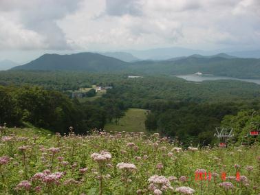 ![]() 【振り返ると草原には秋の花とトンボが】 遠くに玉原湖が光っている。 |