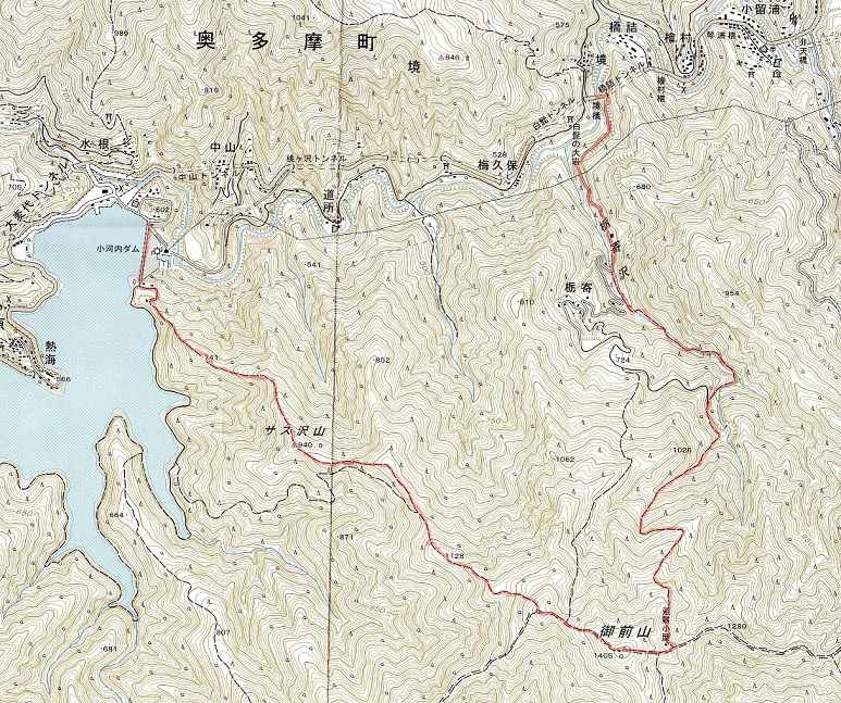 =奥多摩湖(8:55着)〜登山口(9:10)〜サス沢山(10:30)〜惣岳山 1350m(11:50)〜御前山(12:15/12:35)〜トチノキ広場〜栃寄登山口〜境橋バス停(15:05)