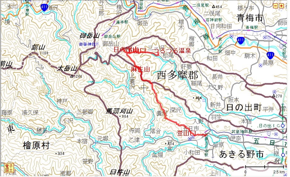 我孫子駅(5:33)=武蔵野線経由=武蔵五日市駅(7:57)〜登山口(8:25)〜金毘羅山(9:00/9:15)〜麻生山 昼食(11:25/12:10)〜日の出山(13:00/13:20)