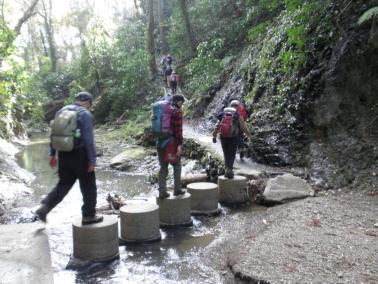 ![]() 【ぬかるみの山道。滑らぬよう足元見ながら慎重に】 |