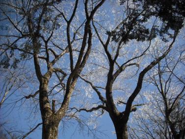 - 気温が上がるにつれ、樹木に付着した凍った雪がシャワーのようにおちてきた。