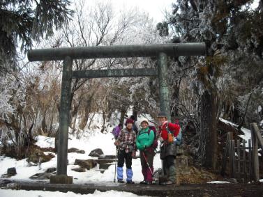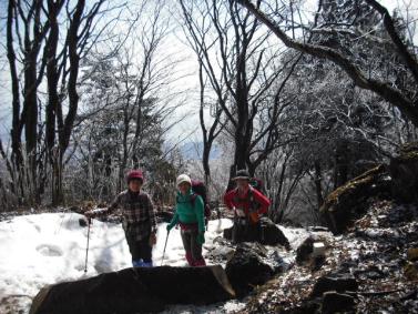 - 見晴台へまわるコースは登りより雪が多く、アイゼンを利用。