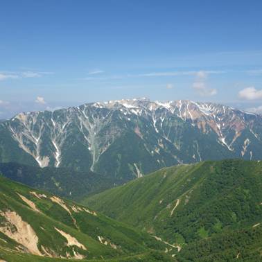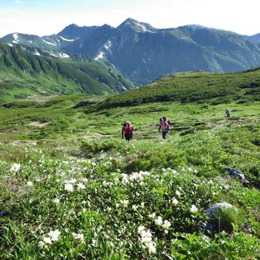 晴れ渡った青空と緑と花と北アルプスの山肌はまさに絶景の極みである。