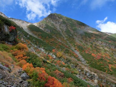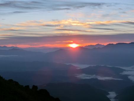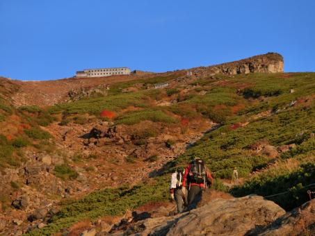 ![]() 【朝日と紅葉の中を王滝口頂上をめざす】 |
