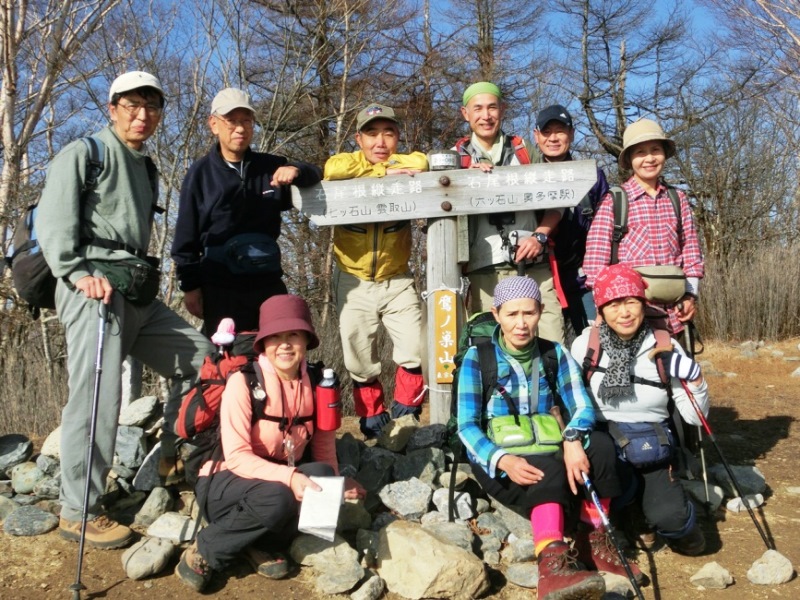 我孫子(/5:33)=新松戸駅=西国分寺駅=青梅乗換=奥多摩駅(8:26/8:35)=バス=東日原(9:05/9:15)〜稲村岩(10:10/10:15)〜ヒルメシクイノタワ(12:00/12:05)〜山頂(12:30/12:50)〜水根沢キャンプ場(15:30/)