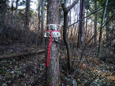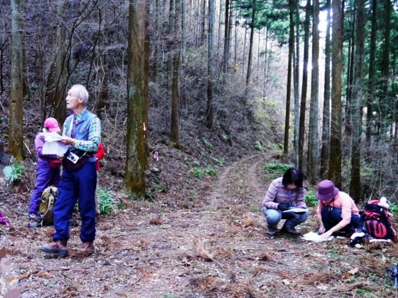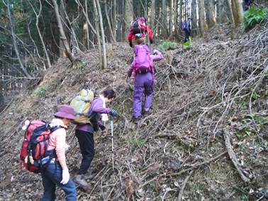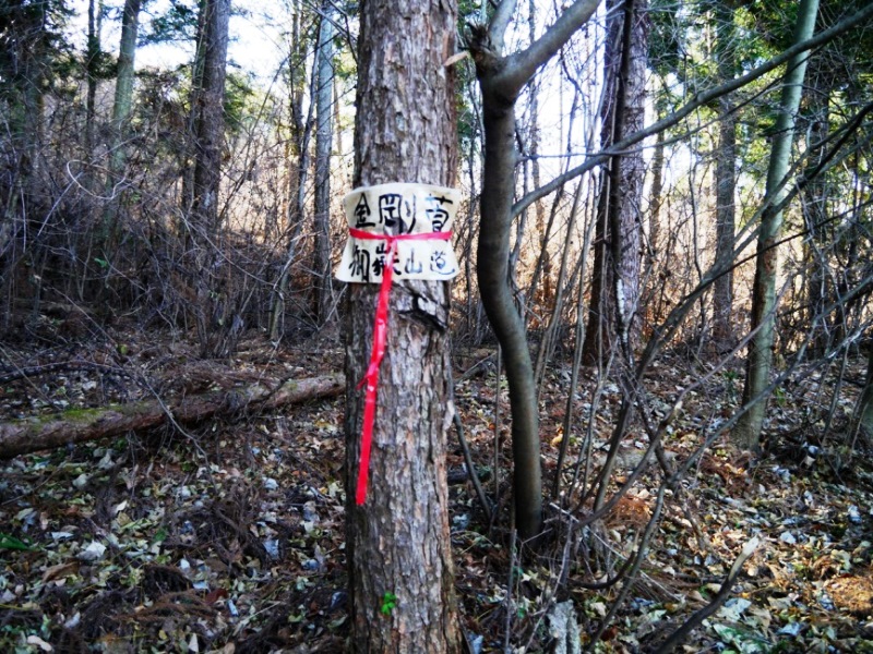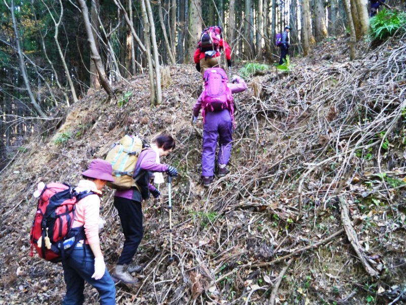 鹿の湯橋から地図を片手に林道を進が登山にふさわしい踏み跡が見つからない。思い切って杉林から藪に突入。