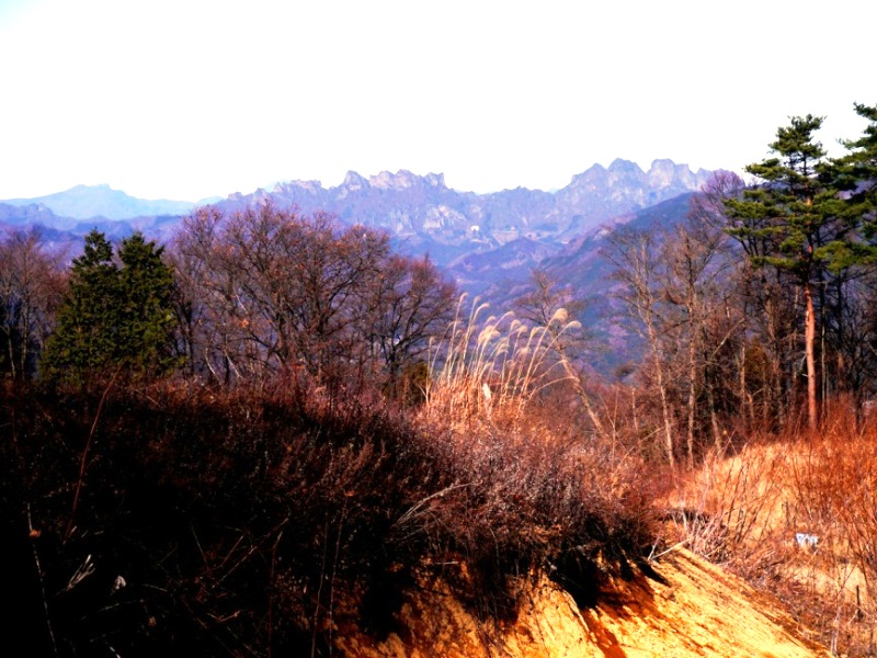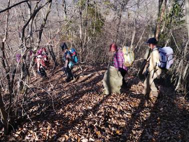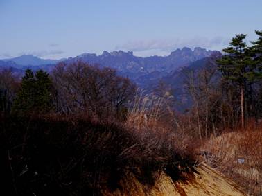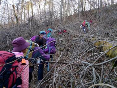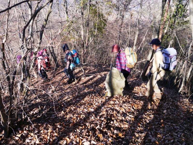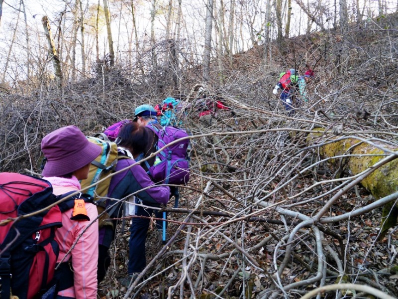 展望の良い開拓地を横断して稜線の一番低い所を狙い急斜面を這い上る。南側が断崖の山頂には多くの石仏が。