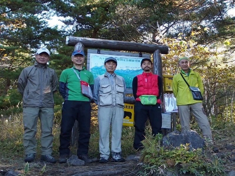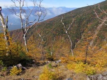 【三ッ頭からの下山道にて】 三ッ頭から木戸口への下りは紅葉が進む。 遥か遠方に御嶽山 |