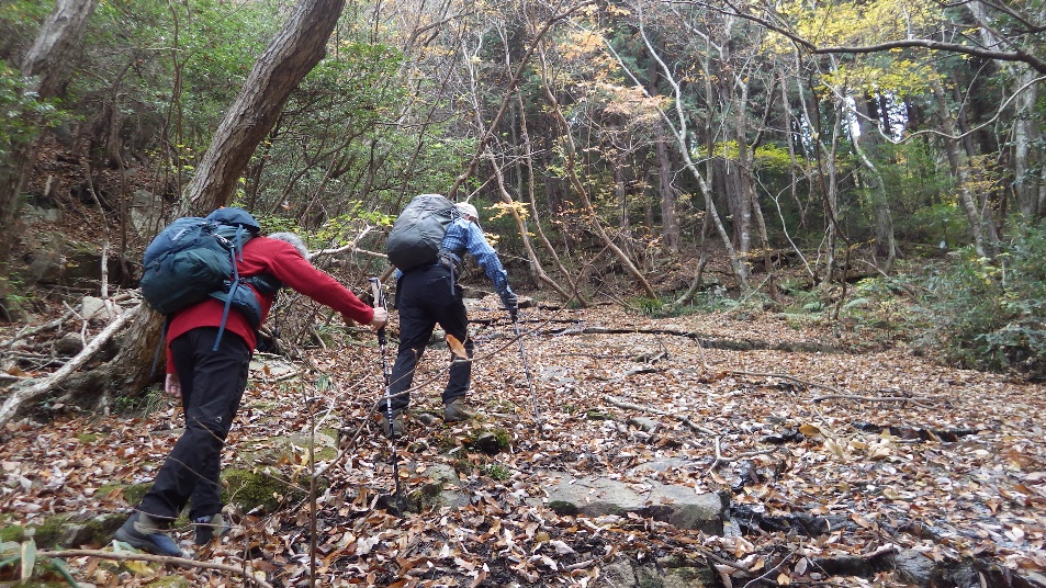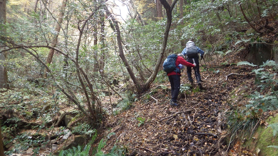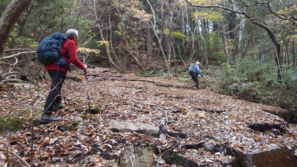 ◍ヤマップには新しく整備された古道「かさまみち」を通るとのことだったが、かさまみちの案内、看板等は一切目にしなかった。 ◍道は沢添いに続くが、筑波山系とは思われない岩床、スラブ滝が続く。 ◍磐座の巨石帯の通過も面白く経由する変化のあるコース。