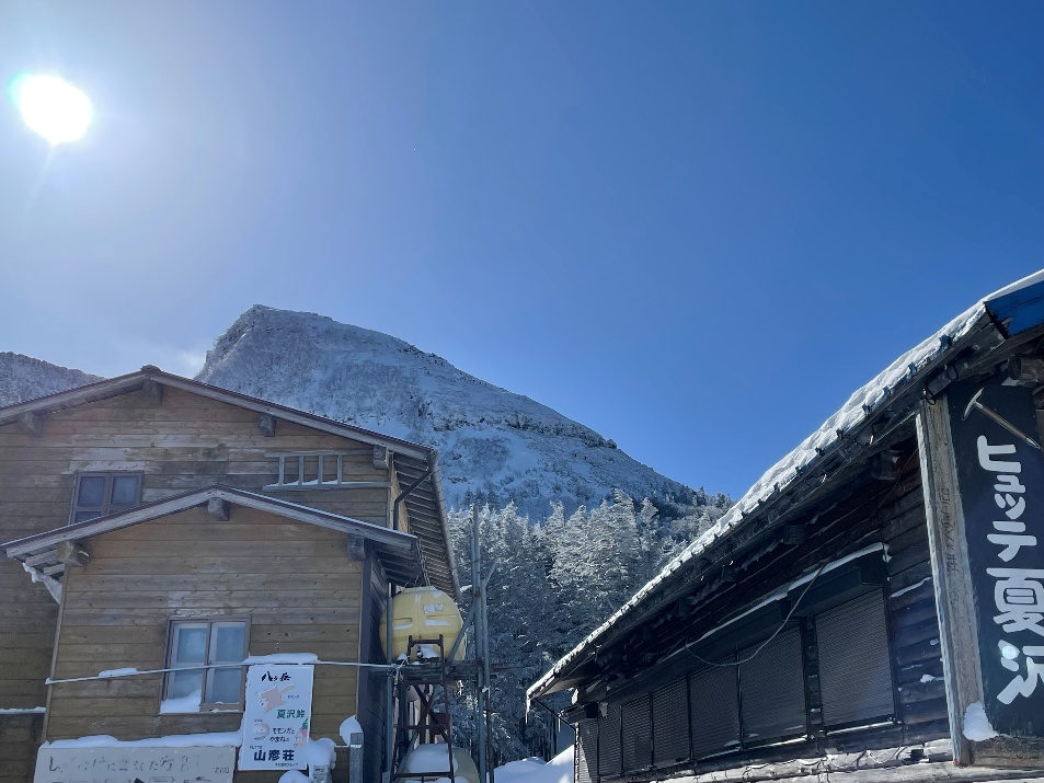 1/30 天王台駅(5:38)=我孫子駅(5:42)=日暮里(6:12/6:20)=新宿(6:41/7:00)=茅野(9:07/9:30送迎バス)=桜平(10:20/10:25)~夏沢鉱泉(11:05/11:35)~オーレン小屋(12:40/13:05)~箕冠山(14:15/14:30)~根石岳山荘(15:00)